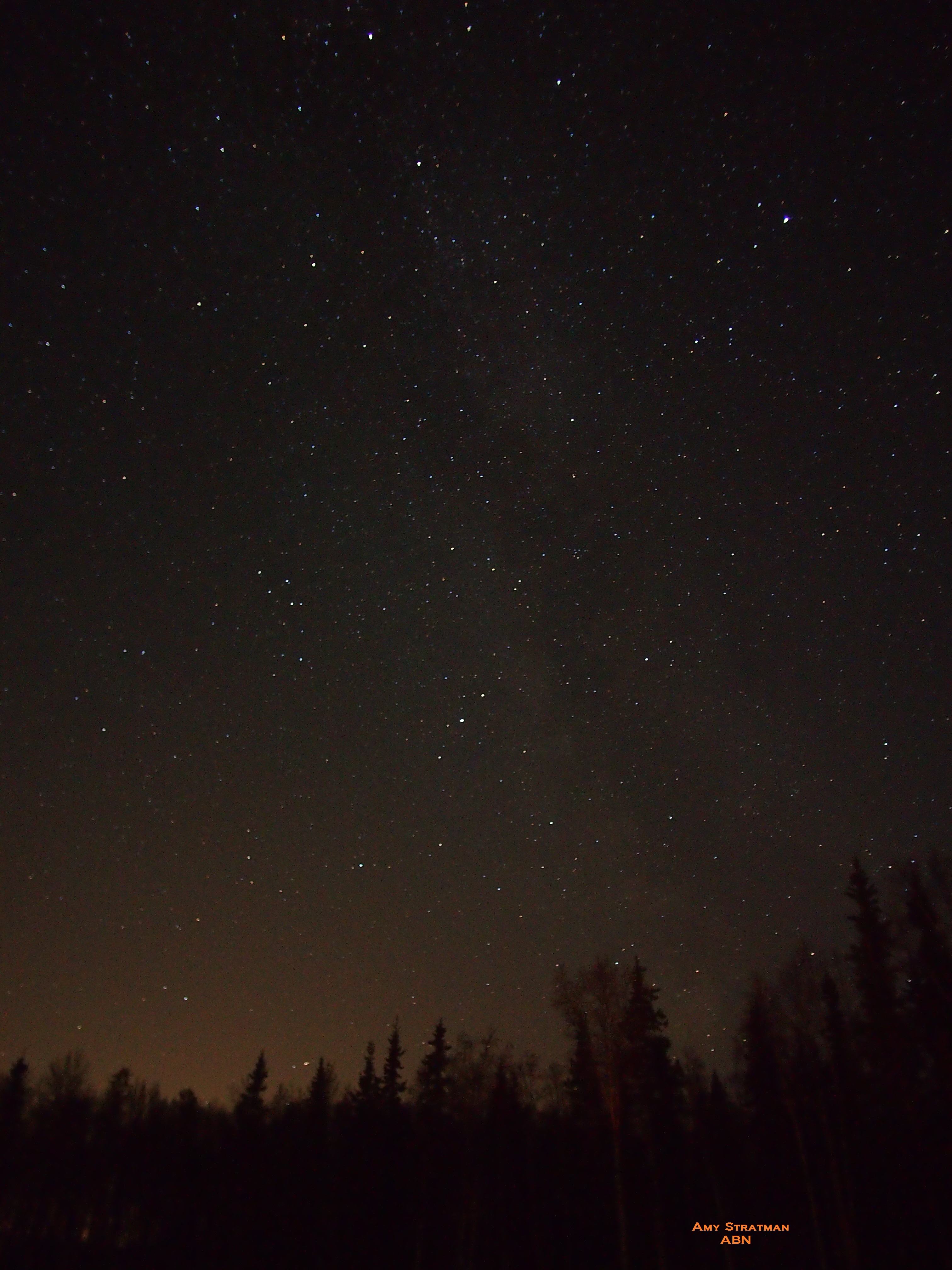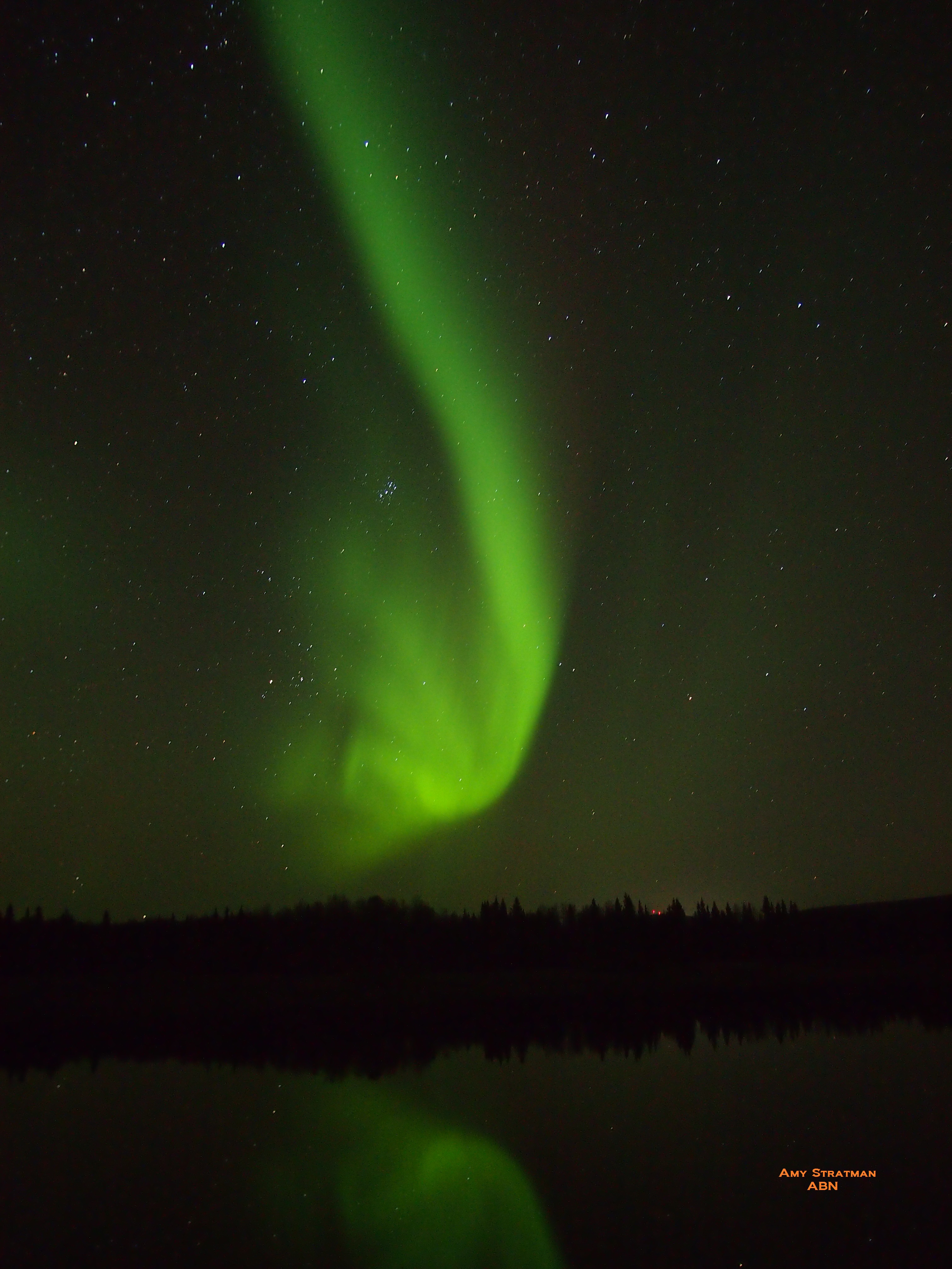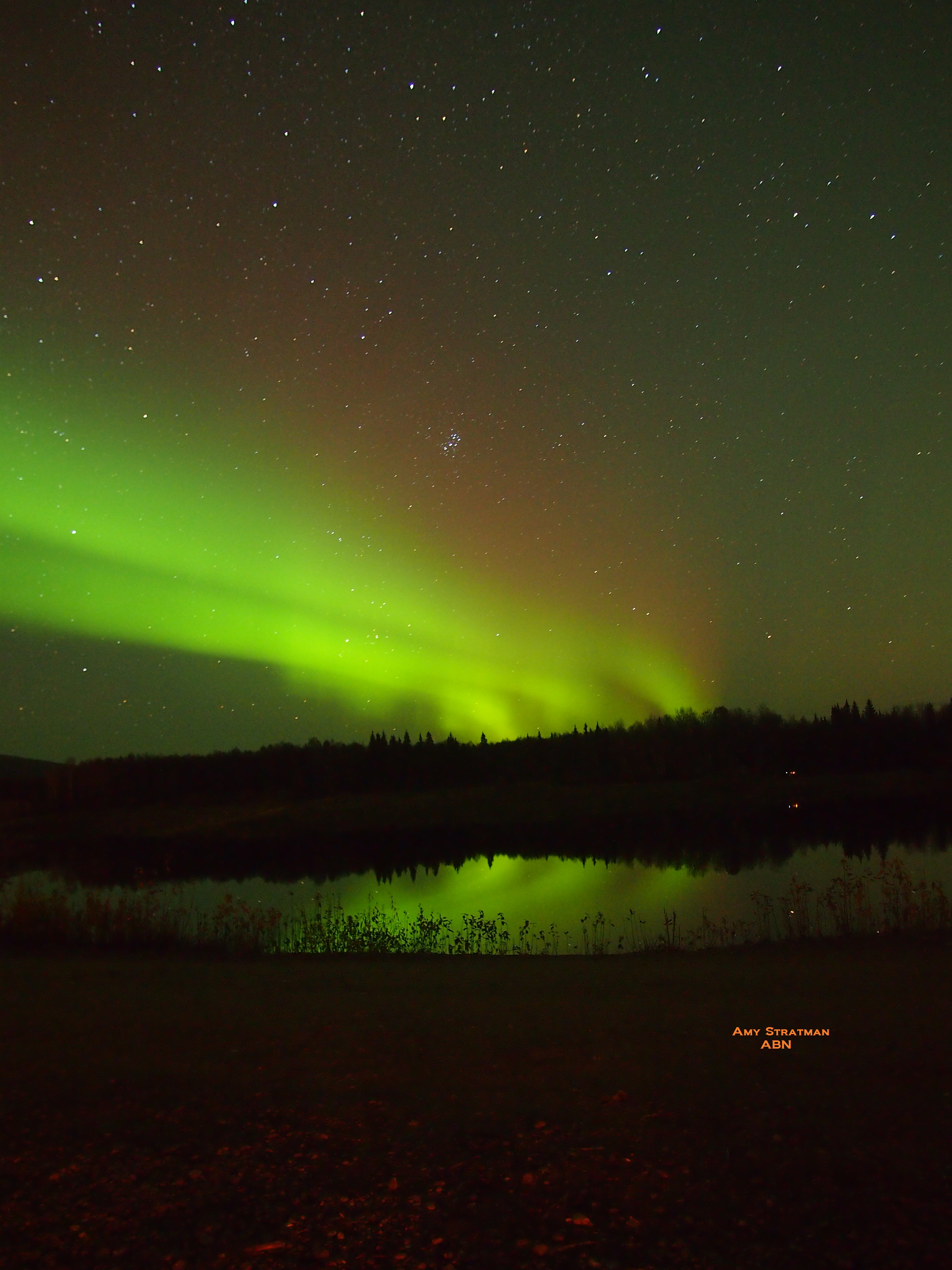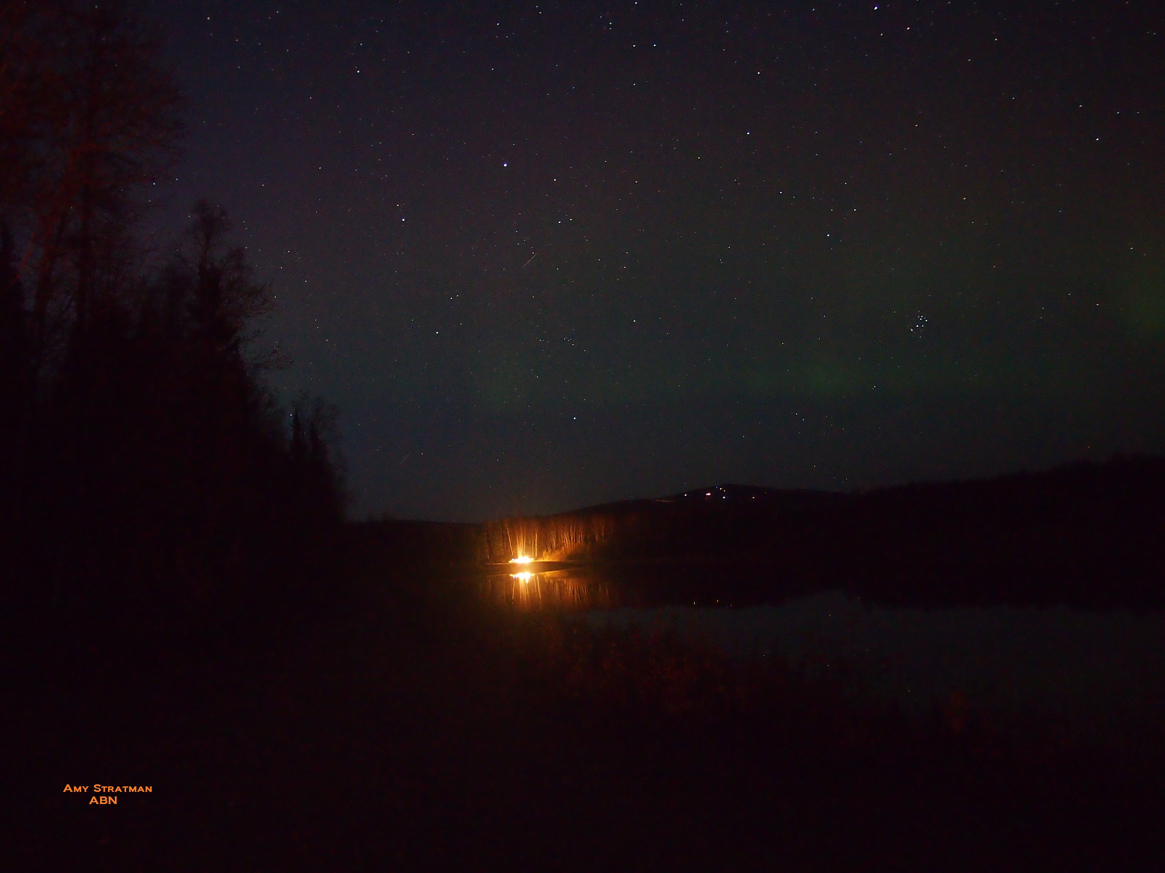 I spent the night at Olnes Pond, just north of Fairbanks on Saturday night. About 9 adults and 6 children were present as well. It was a great night to sit by a fire and watch the northern lights. The show was mostly faint, but occasionally, the lights brightened and reflected over the pond. About 4-5am, the aurora was toward the south, not a usual direction to look from our latitude. A good time was had by all.