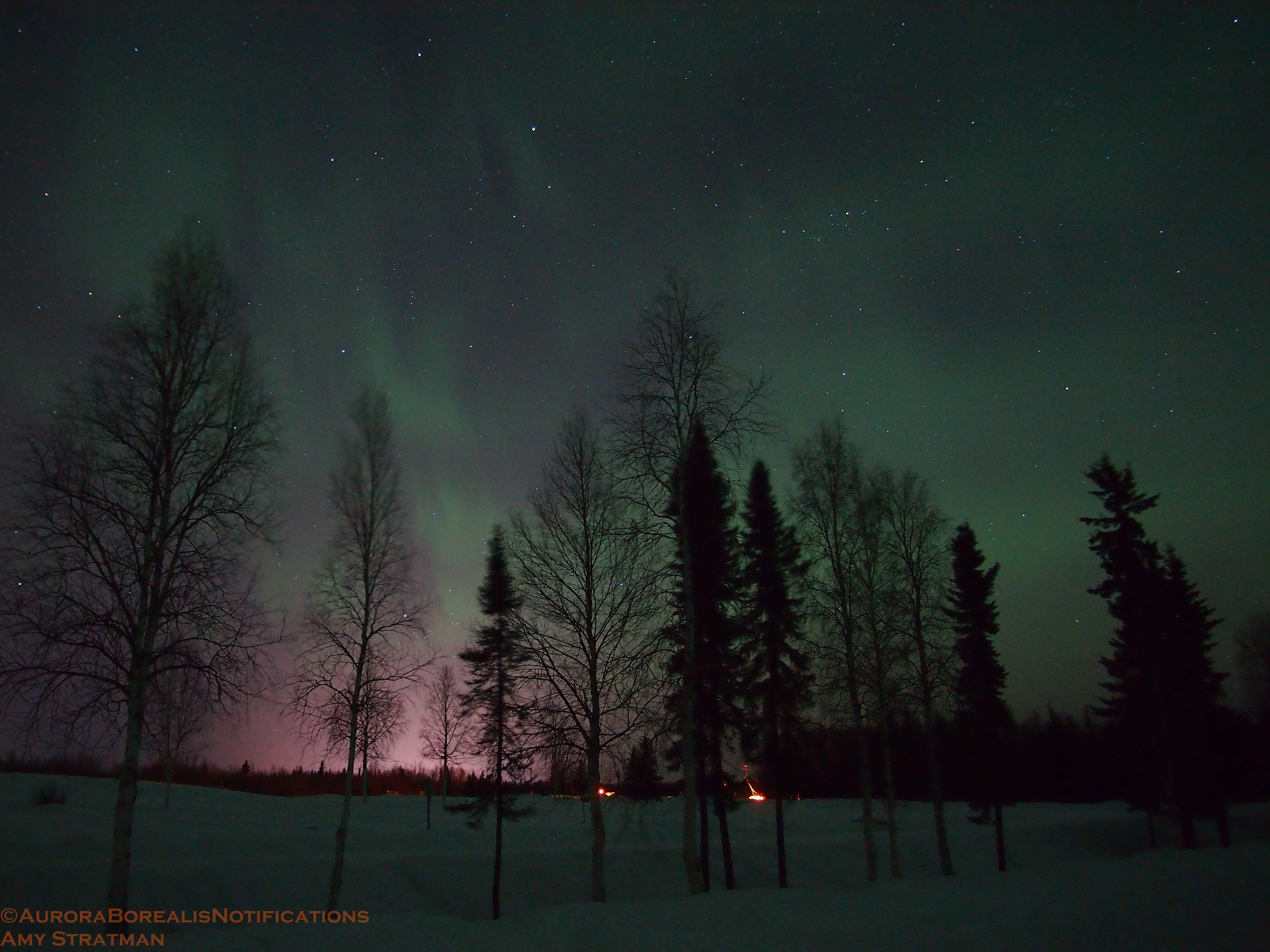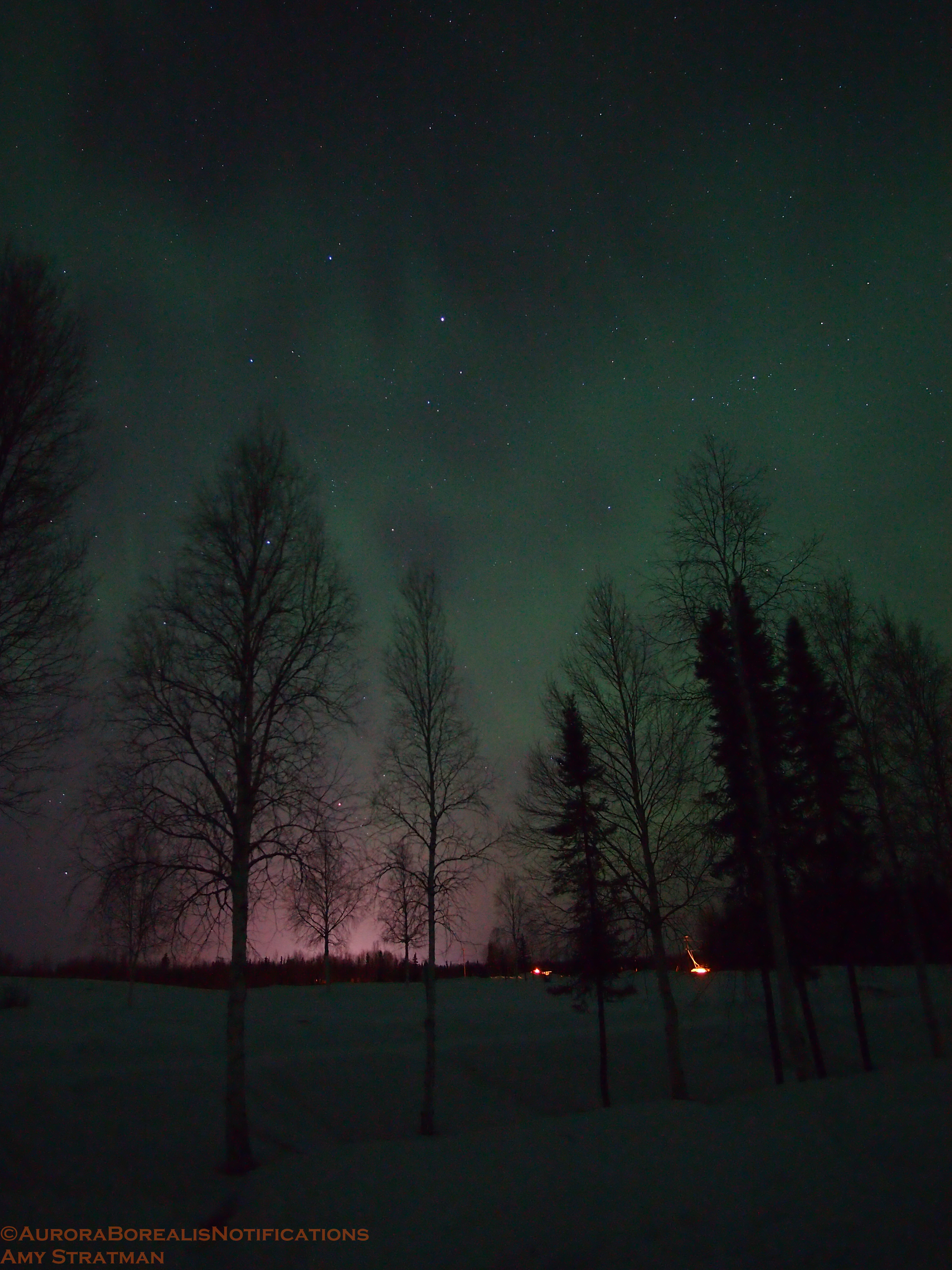 Last night the aurora remained faint, but displayed over the entire sky in every direction. Here are some photos I took at Chena Lakes, North Pole, Alaska. The pinks in the photos are from light pollution from the city of North Pole, and also Eielson Air Force Base. I rented a different lens from Alaska Camera (a Fairbanks business), and I have noticed a difference with what I can do. I can’t wait to try it out tonight on a stronger aurora.